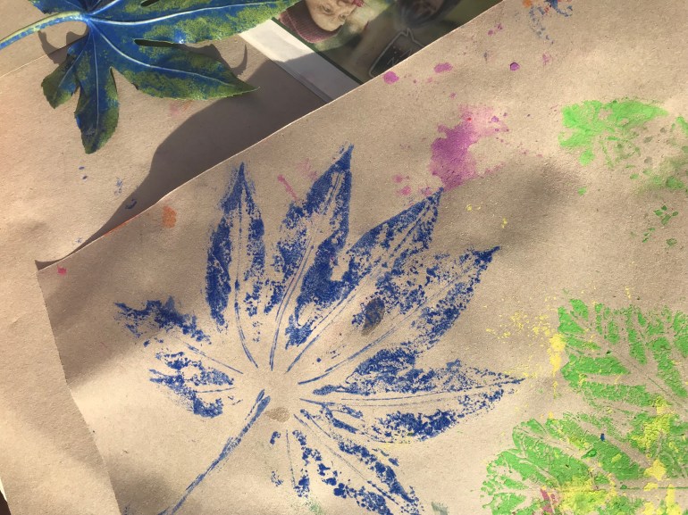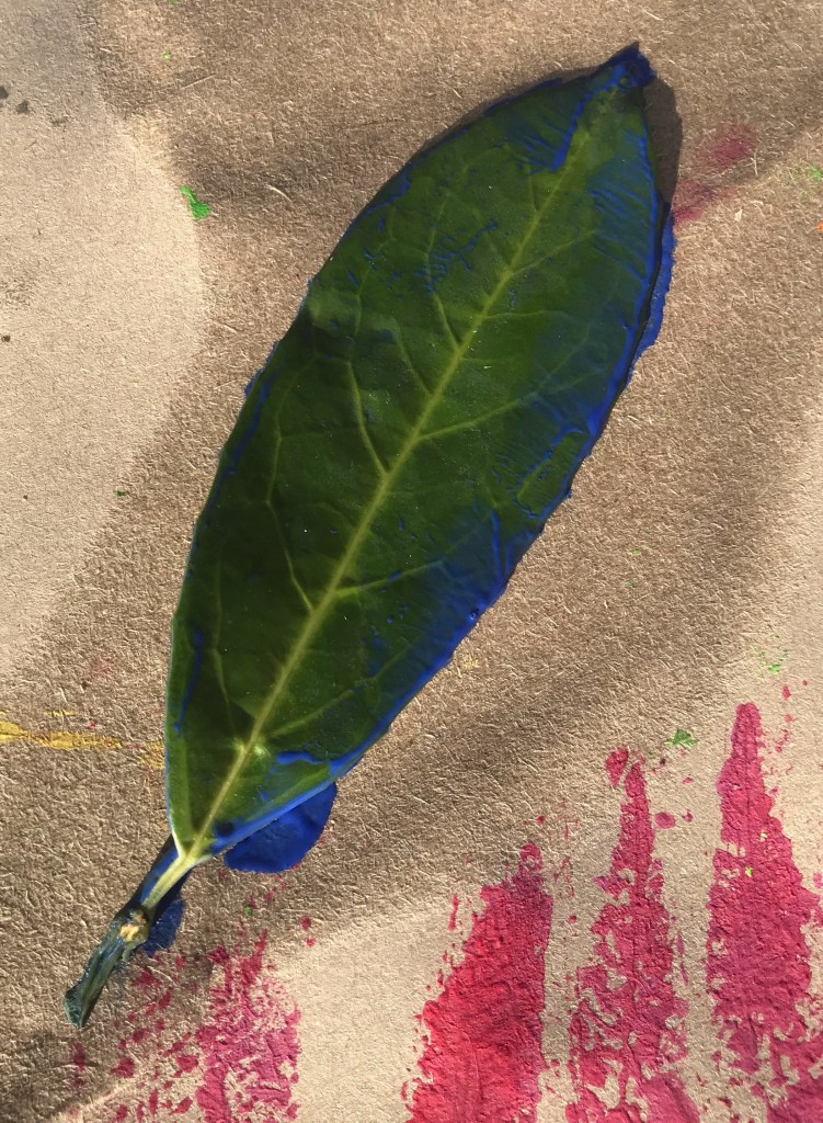 Here we have the Laurel Leaf ‘print’ in royal blue poster paint. Look closely. You will notice the leaf rib and veins creating an unusual print pattern.